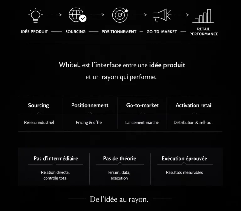 WhiteL est l’interface entre une idée produit et un rayon qui performe. Nous couvrons l’intégralité de la chaîne de valeur — sourcing, positionnement, go-to-market, activation retail — pour les distributeurs qui veulent gagner en catégorie, et pour les marques qui veulent exister en Europe. Pas d’intermédiaire. Pas de théorie. Une exécution éprouvée.